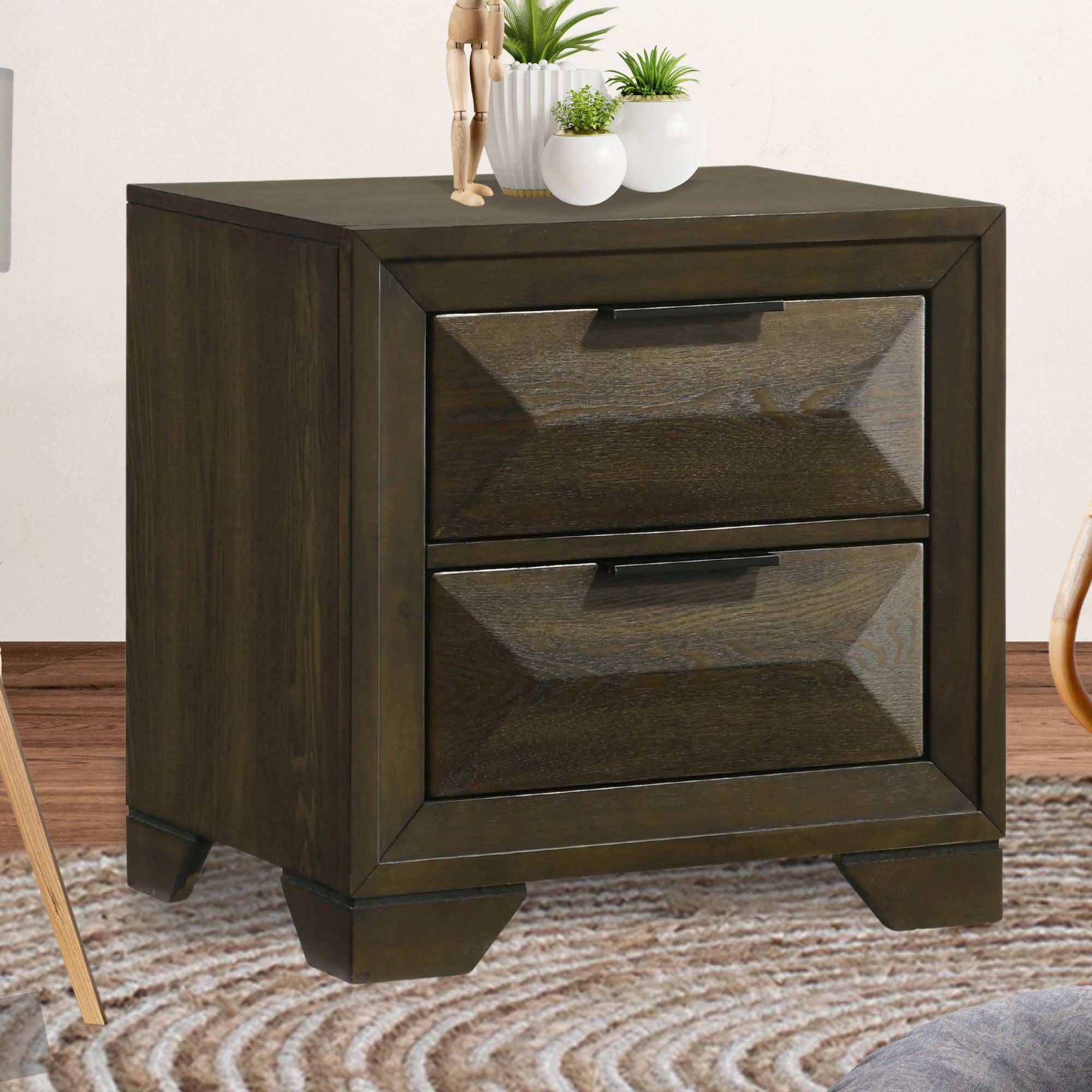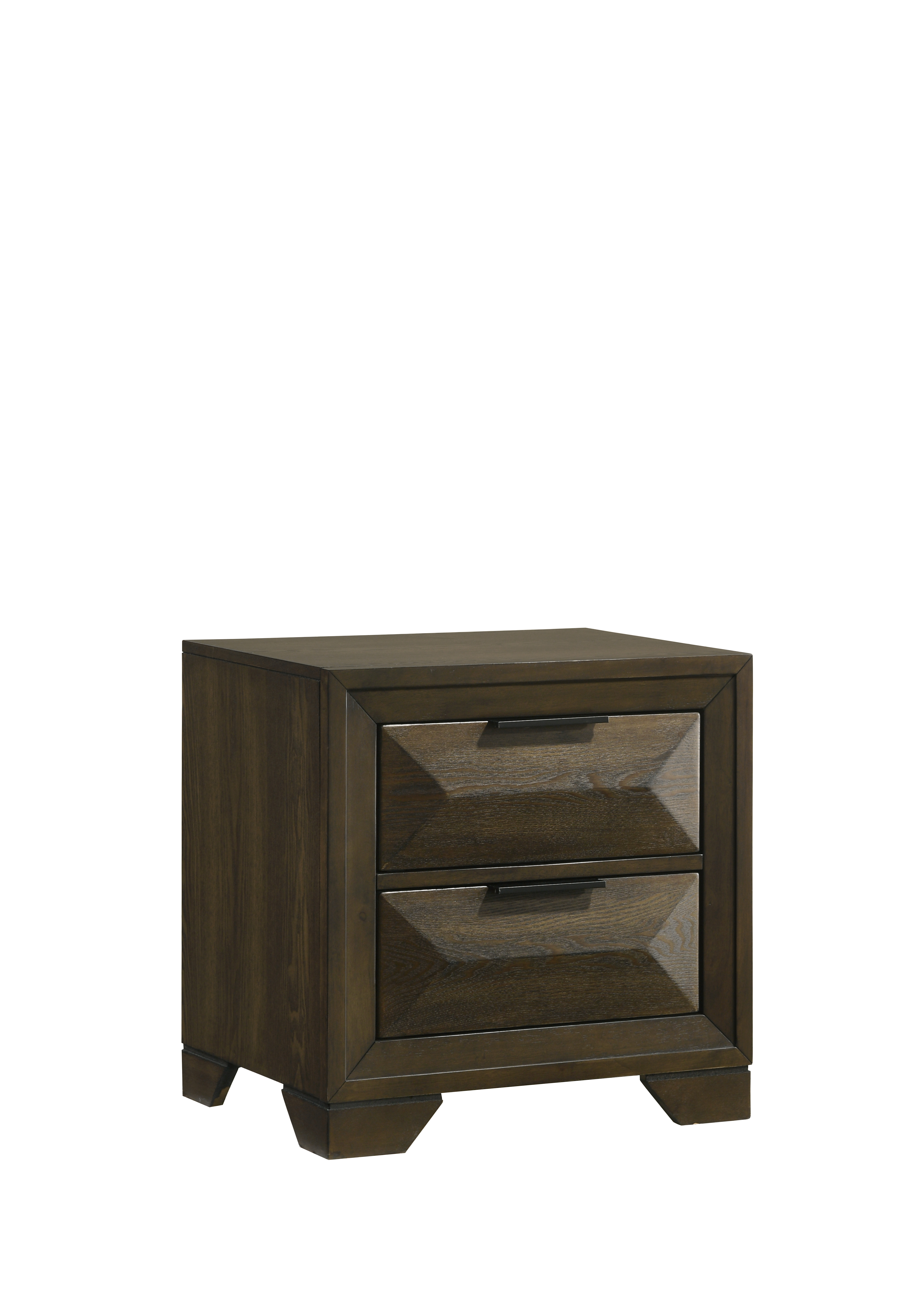 Check out the Boudin Nightstand, a stunning addition to any residential setting. Crafted from solid wood and finished entirely in a rich walnut color, this nightstand boasts two useful drawers. Each drawer features a unique geometric design with sloping triangles that add a touch of modern sophistication. Black metal handles complement the sleek aesthetic, ensuring effortless functionality with smooth Kenlin center glides. The Boudin Nightstand seamlessly blends style and utility, elevating the ambiance of your bedroom.