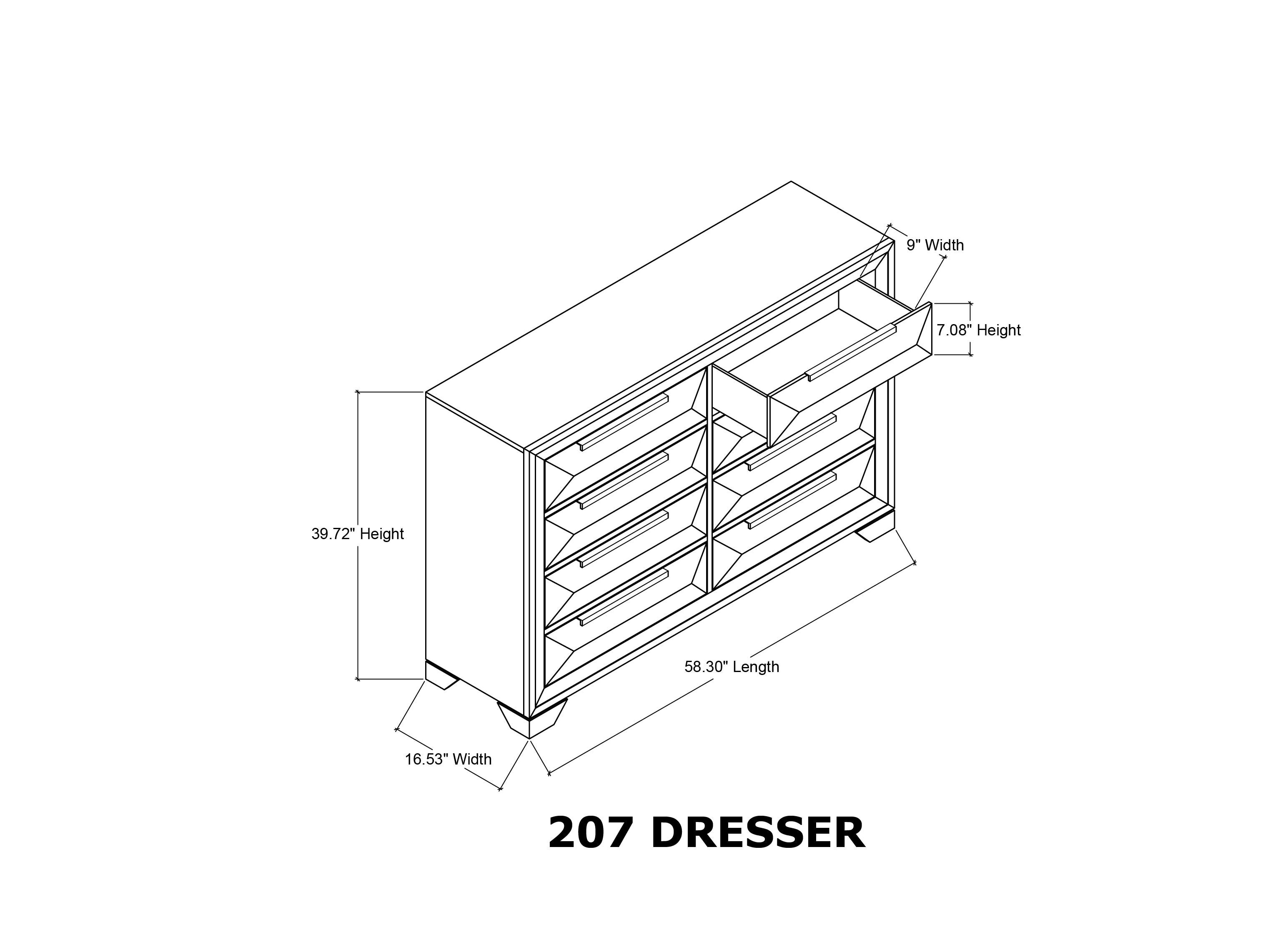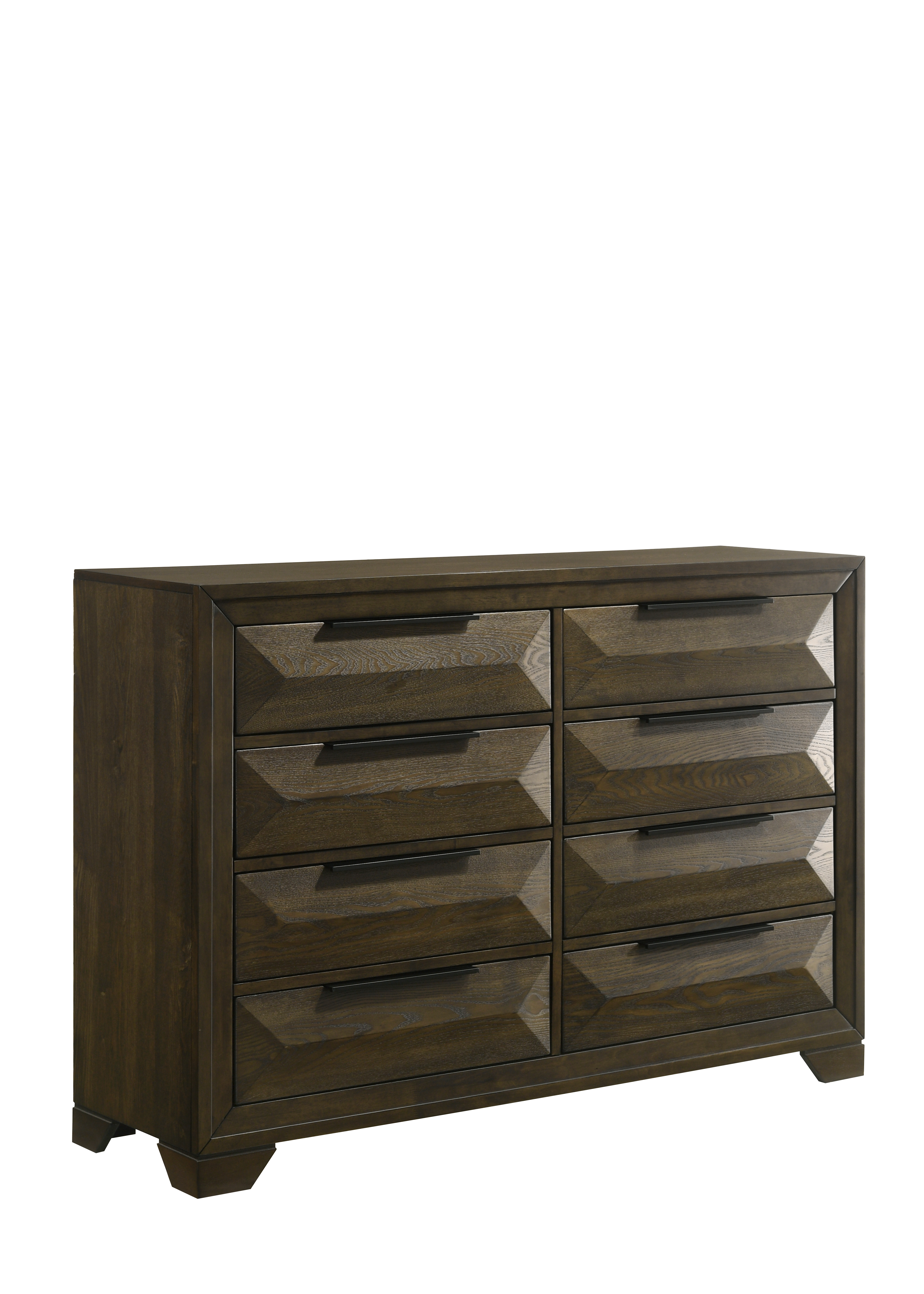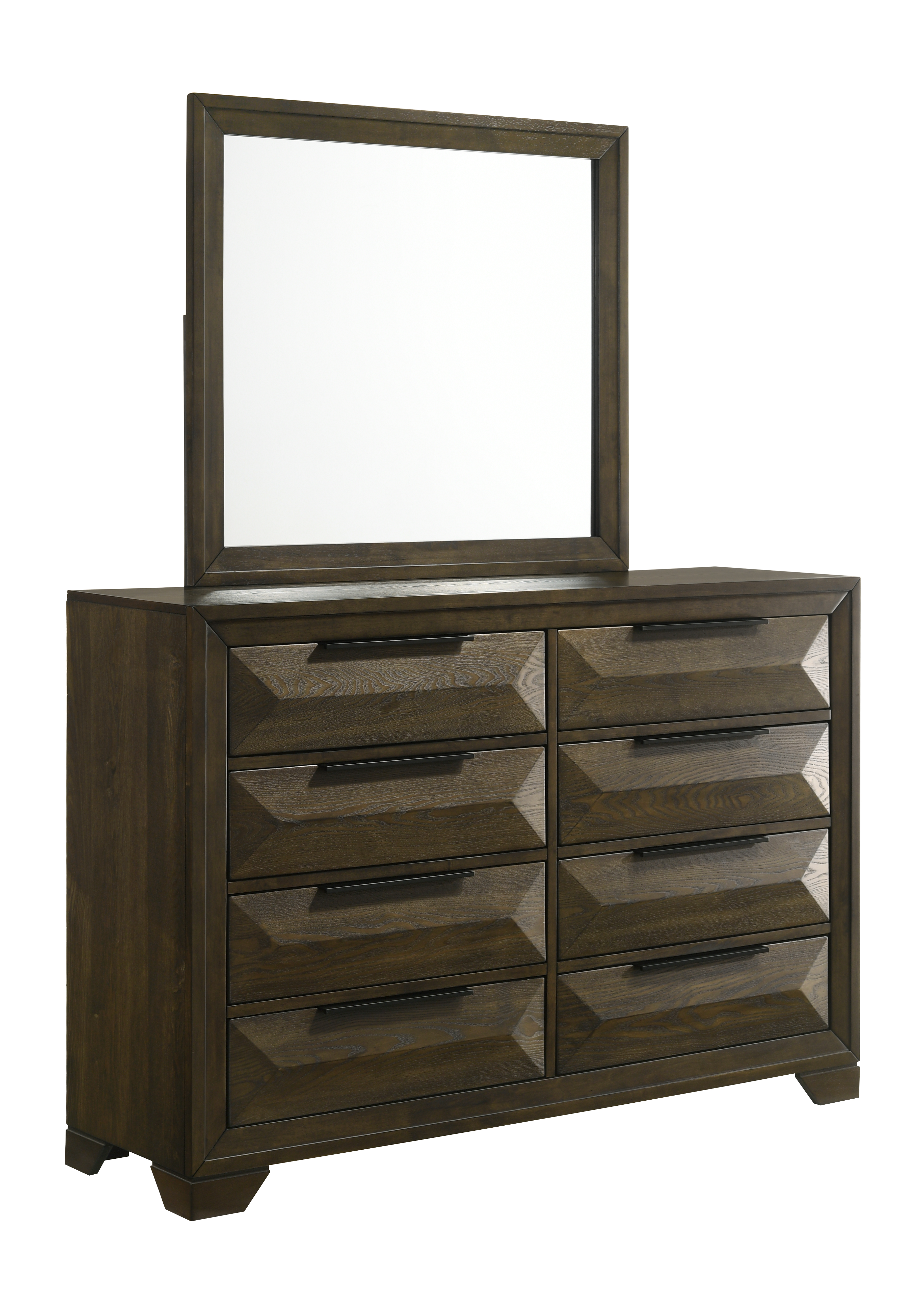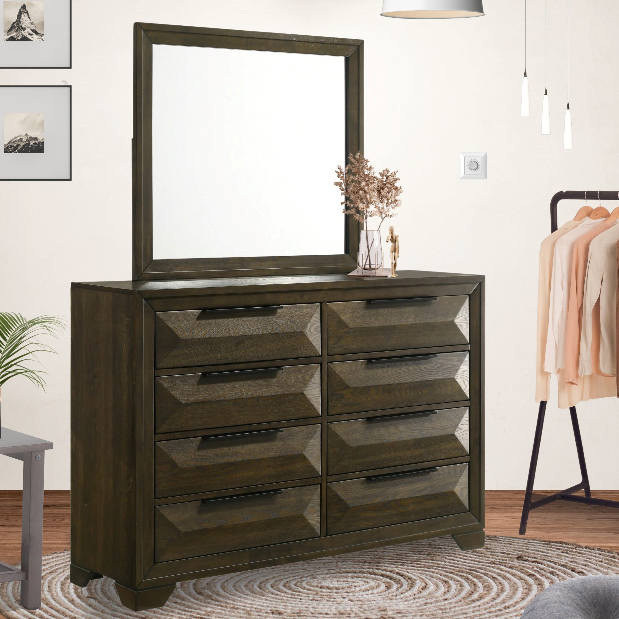 Check out the Boudin Dresser/Mirror, a stunning addition to any residential setting. Crafted from solid wood and finished entirely in a rich walnut color, the dresser boasts eight useful drawers. Each drawer features a unique geometric design with sloping triangles that add a touch of modern sophistication. Black metal handles complement the sleek aesthetic, ensuring effortless functionality with smooth Kenlin center glides. The attachable mirror complements the dresser while adding depth to your room. Together, this dresser/mirror seamlessly blends style and utility, elevating the ambiance of your bedroom.