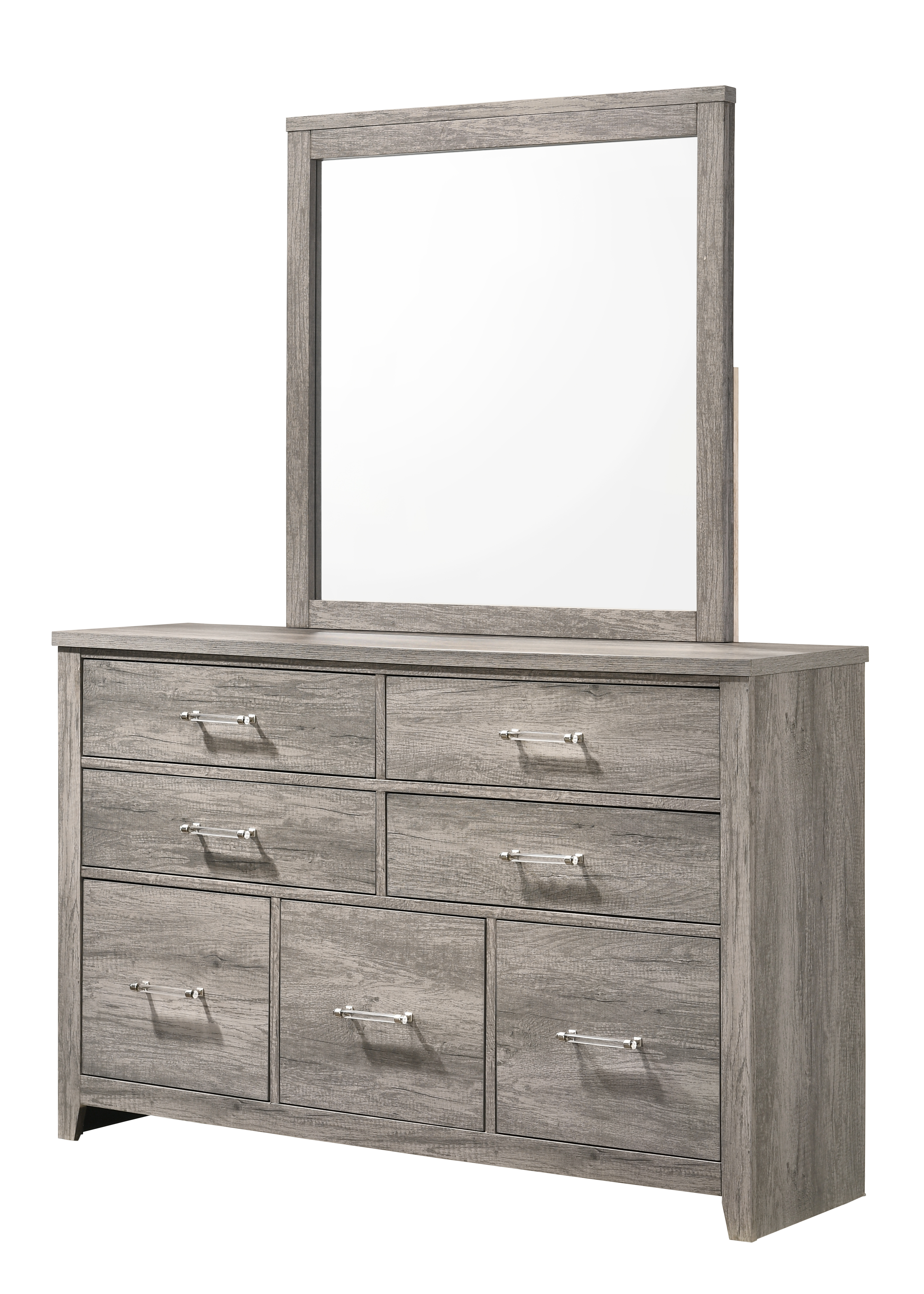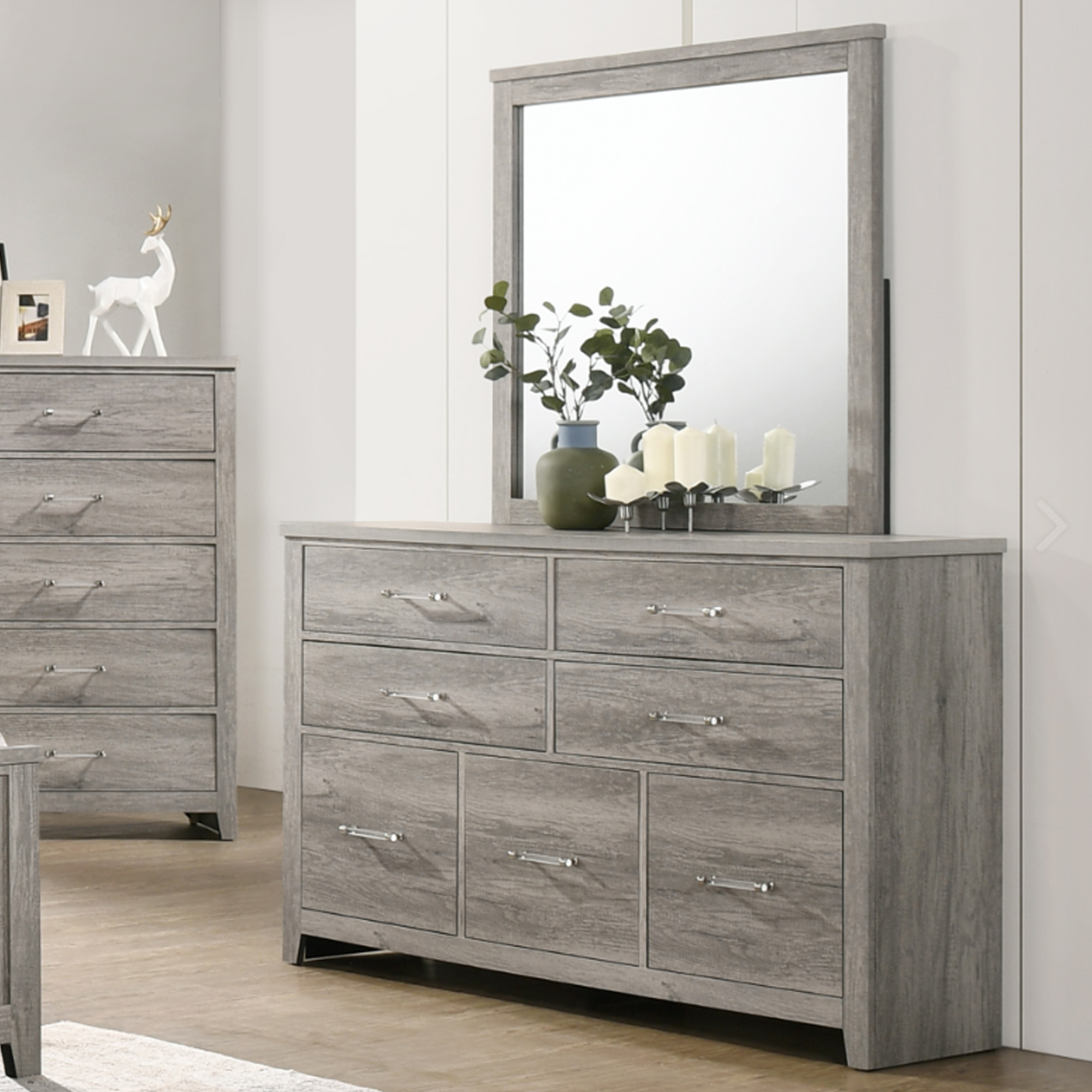 The Harmony Wood Dresser is made of solid wood with a genteel light gray finish. Featuring 4 medium sized drawers and 3 large drawers, each equipped with a stylish chrome & clear handle, this dresser is sure to take care of all your storage needs. The accompanying Harmony square mirror adds flair to the space, providing a clear reflection to its user. These pieces together are the perfect choice for those with refined taste and cultivated preferences.