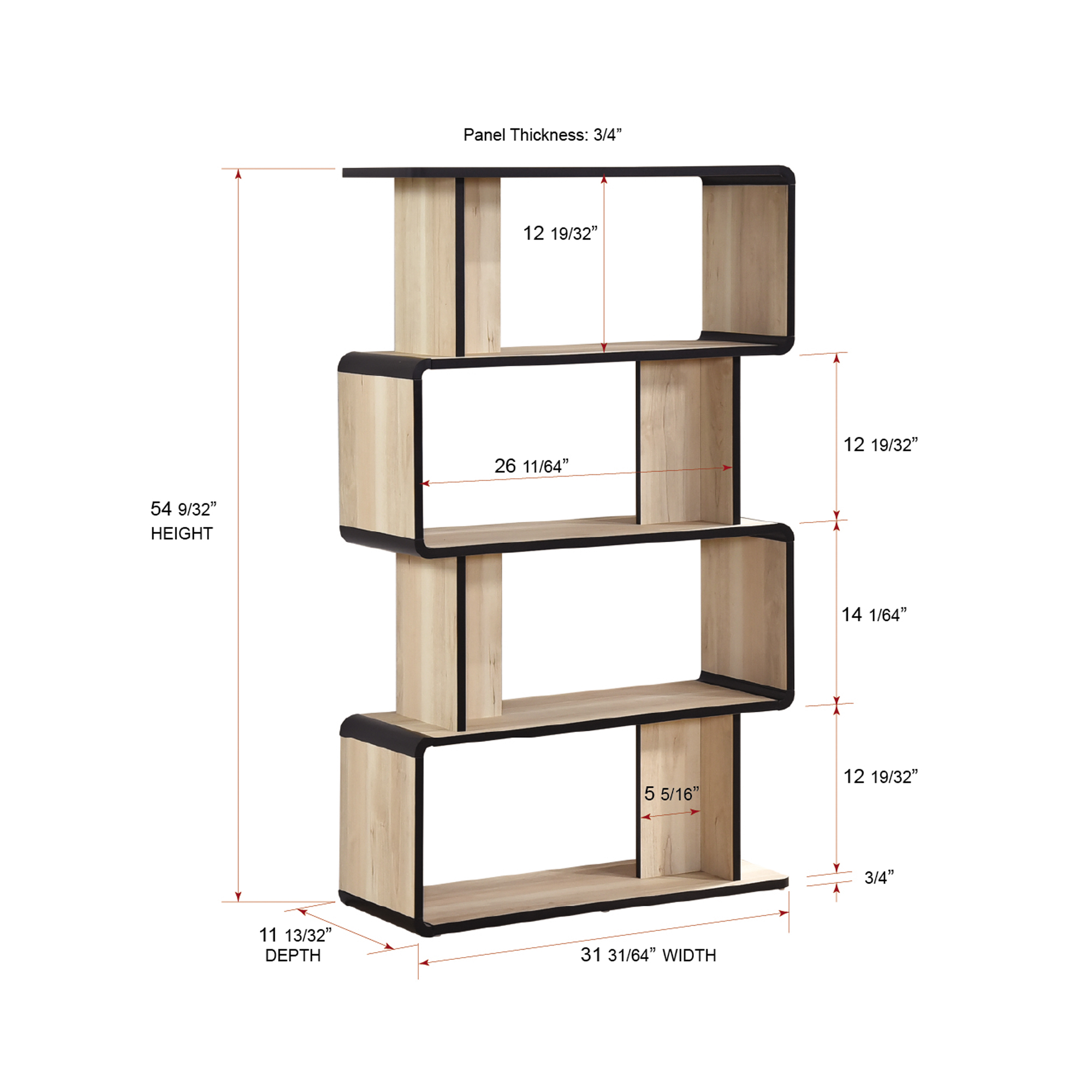 Nathan Oak 4-Shelf Bookcase is a modern and stylish storage solution, perfect for organizing books, decorative items, and office essentials. Crafted from high-quality oak with a natural wood finish, this bookcase features a unique asymmetrical design that adds a contemporary touch to any space. The black trim accents provide a sleek contrast, enhancing its visual appeal.