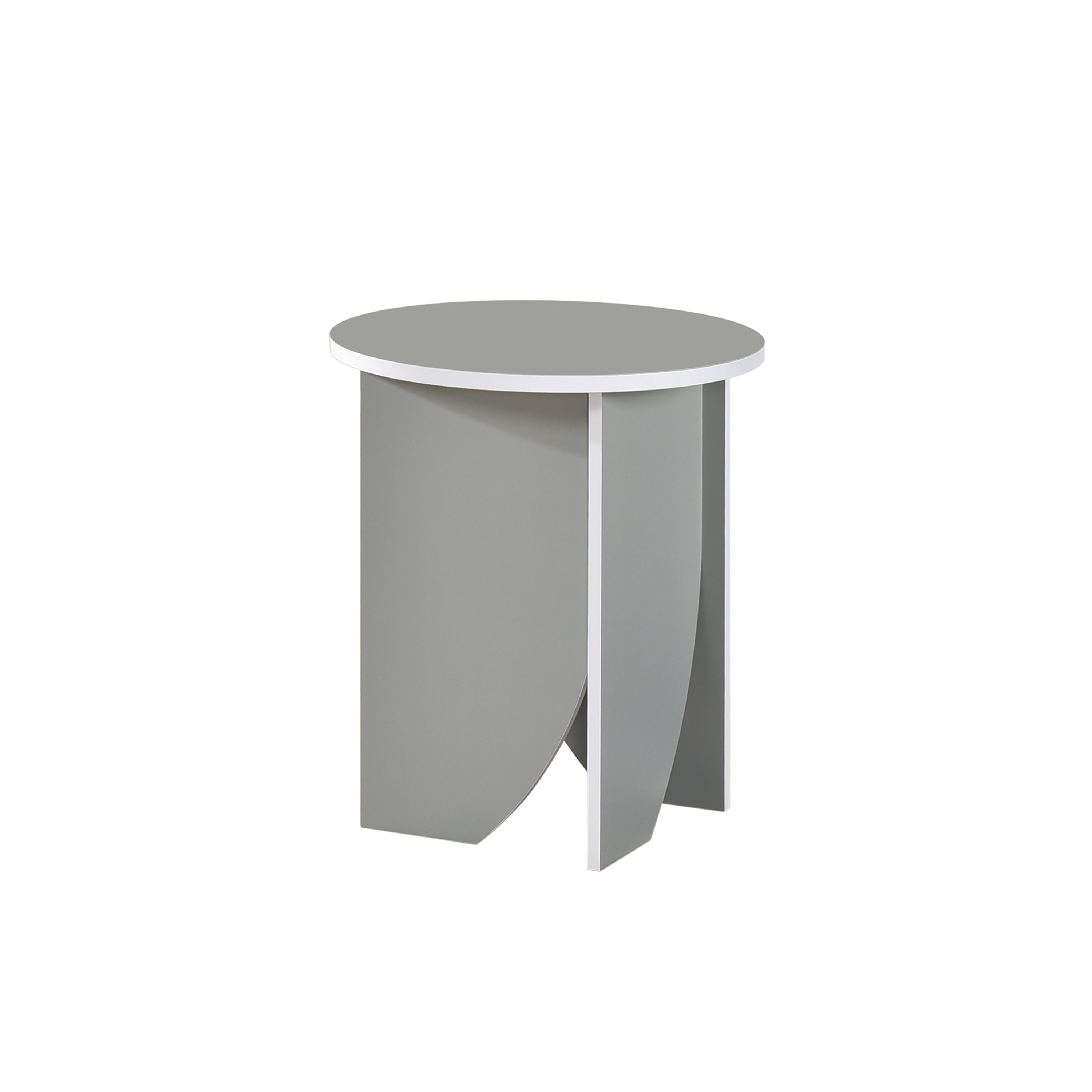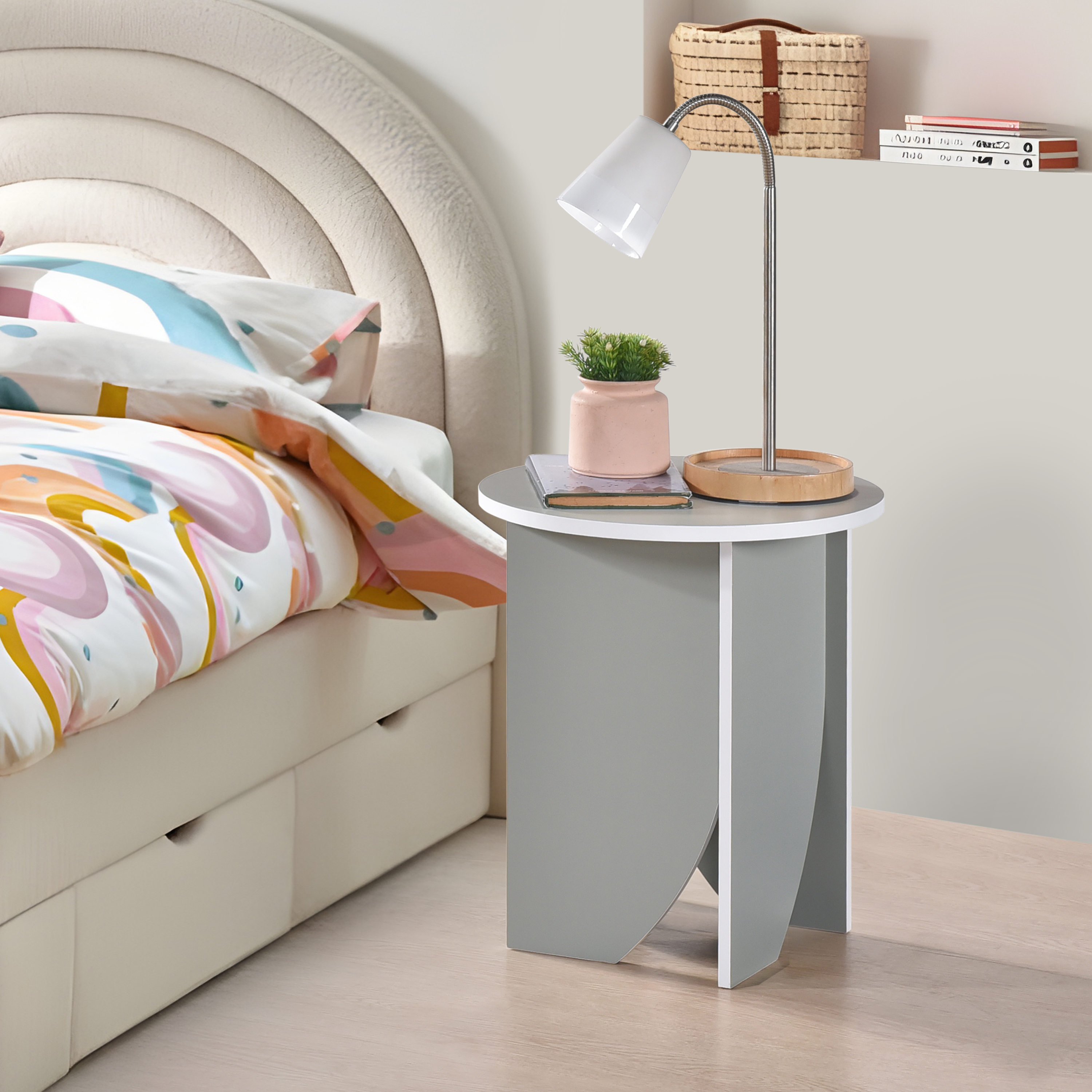 Bring contemporary flair to your space with this Zoe modern end table. Featuring a smooth, round top and distinctive intersecting base panels, it’s a statement piece that blends form and function. The crisp gray finish with contrasting white edges adds a bold, graphic touch, making it perfect as a side table for your sofa, a chic nightstand, or a stylish accent in any room. Durable and lightweight, this table offers a clean, sculptural look that elevates minimalist or modern interiors.